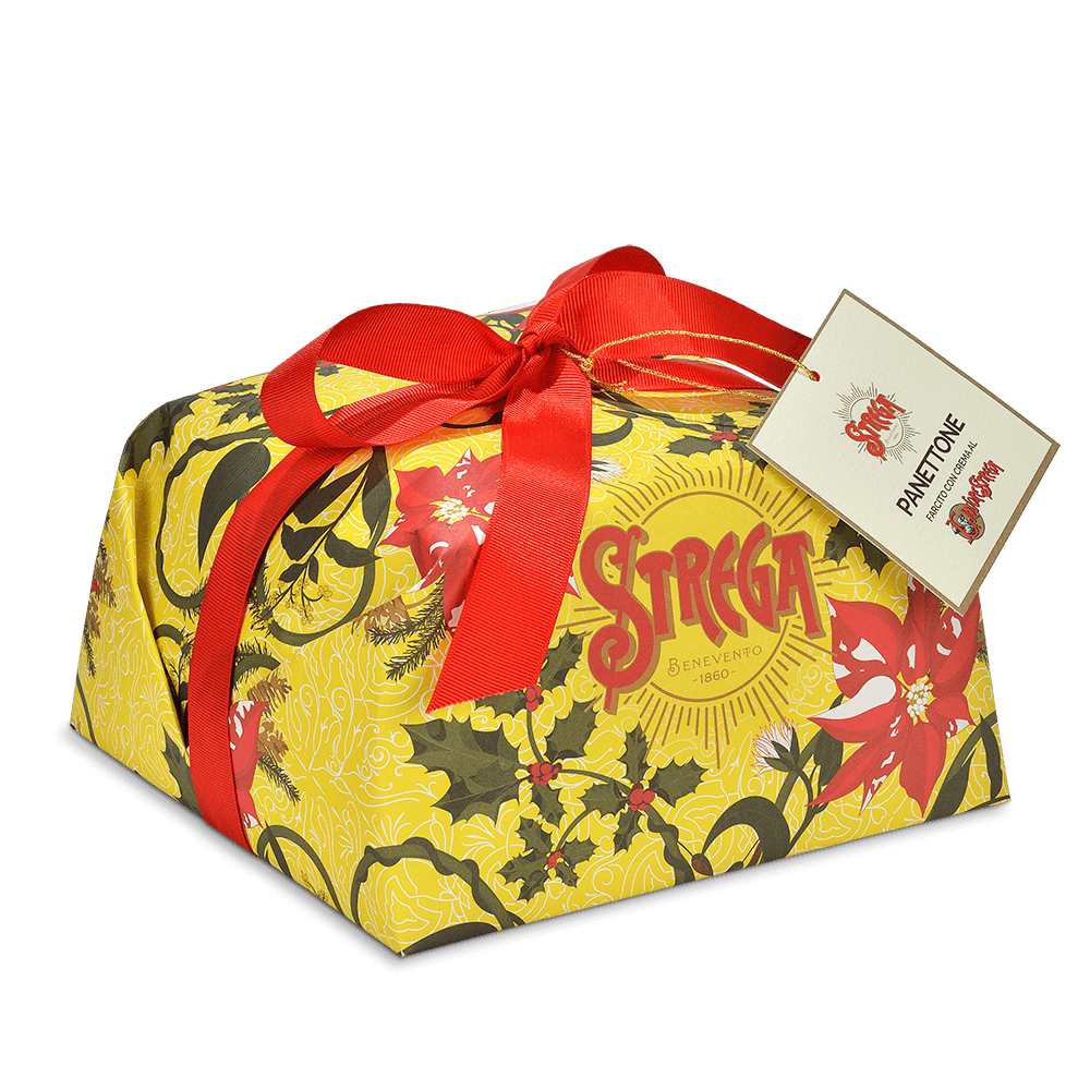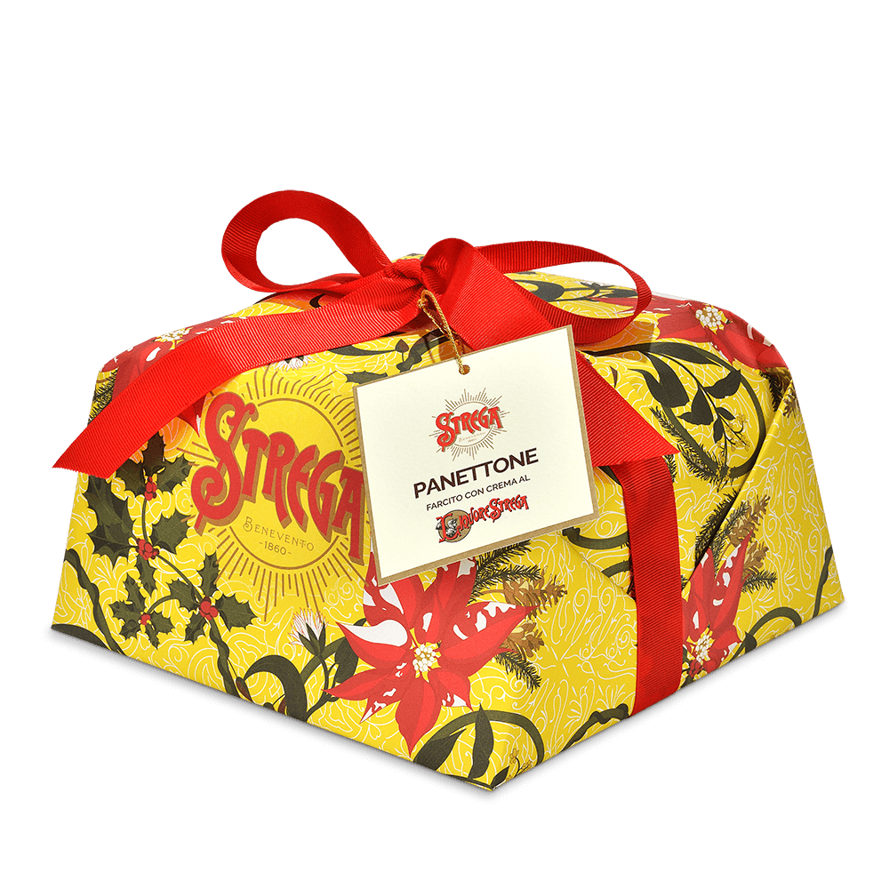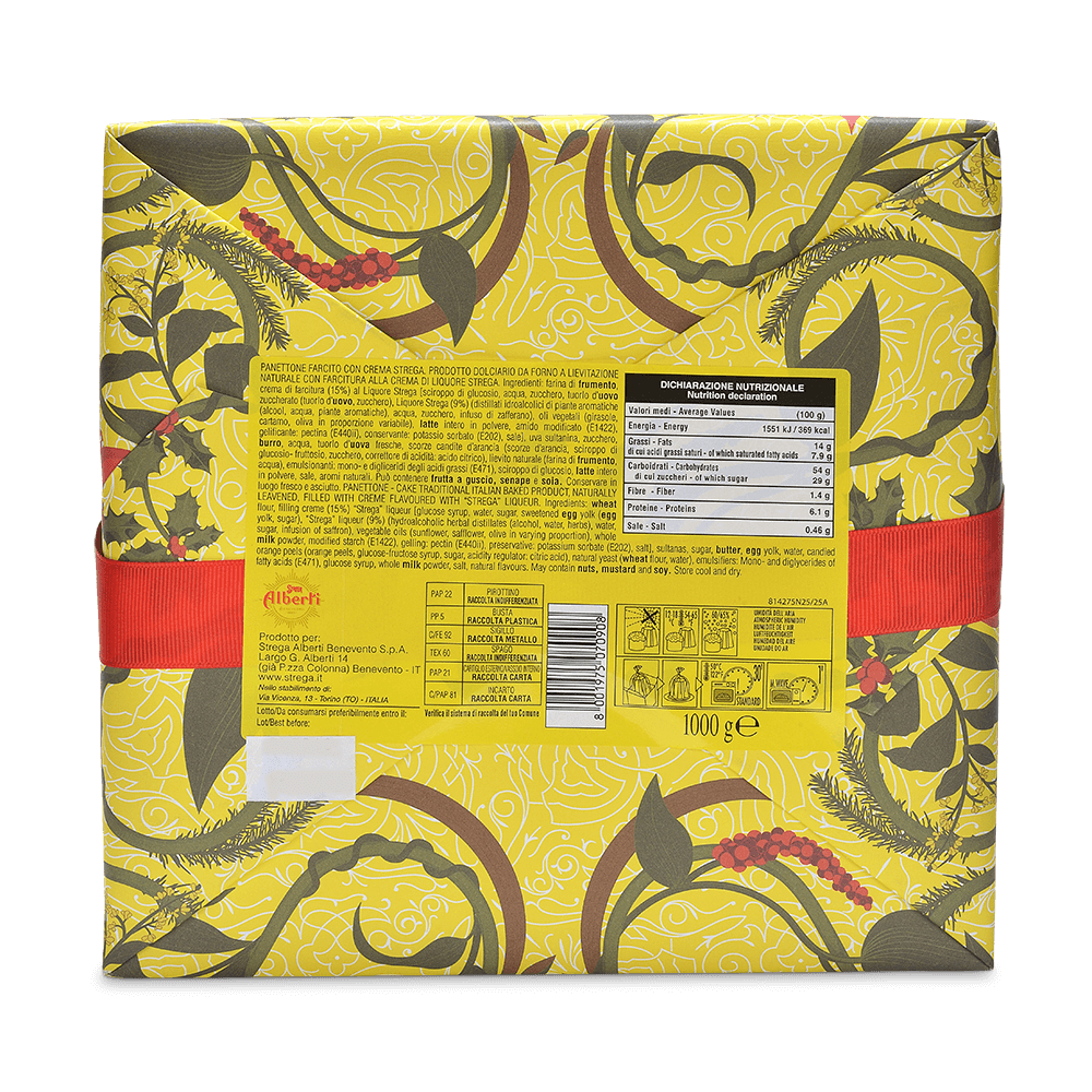 Ingredienti: farina di frumento, crema di farcitura (15%) al Liquore Strega (sciroppo di glucosio, acqua, zucchero, tuorlo d'uovo zuccherato (tuorlo d'uovo, zucchero), distillato Strega (6%) (alcool, acqua, erbe aromatiche), oli vegetali (girasole, cartamo, oliva in proporzione variabile), latte in polvere, amido modificato E1422, gelificante: E440ii pectina, conservante: E202 potassio sorbato, sale), uva sultanina, zucchero, burro, tuorlo d'uova fresche, acqua, scorze candite di arancia (scorze di arancia, sciroppo di glucosio-fruttosio, zucchero, correttore di acidità: acido citrico), lievito naturale (farina di frumento, acqua), emulsionanti: E471 mono e digliceridi degli acidi grassi, sciroppo di glucosio, sale, aromi naturali.